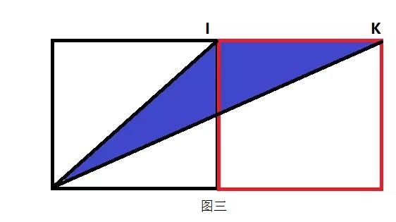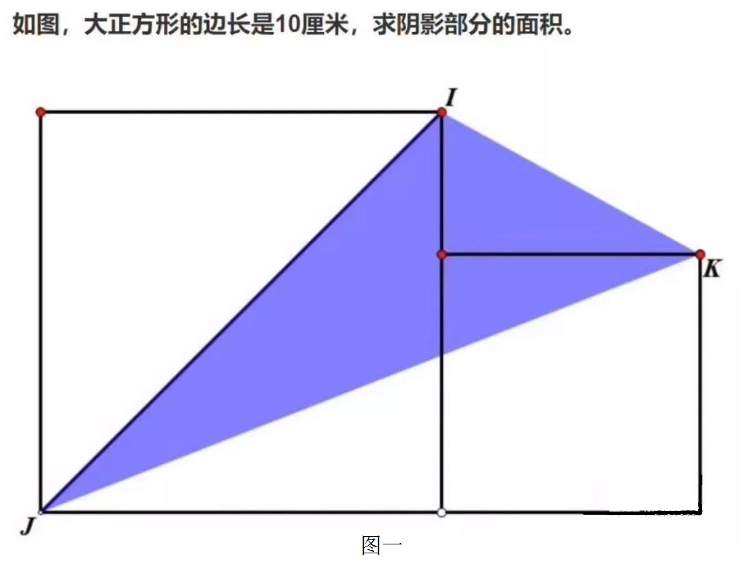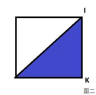 第一种情况,把右侧的小正方形推向无穷小,是不是可以呢?那图形就变成了图二的形状。因为小正方形无穷小,所以K点就到了大正方形的右下角。这个时候,阴影面积正好无限接近半个大正方形。大正方形的面积是10(cm)*10(cm)=100(cm²),那么一半就是50cm²。