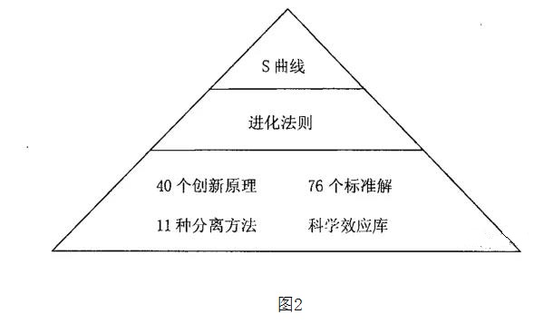 我们在不断地解决产品中的技术问题,这些解决方案中部分被市场选择,部分被市场淘汰。这些最终留下的技术方案累积到一定数量,再连接成线,就构成了进化路径。而由于进化路径带有技术产品的共性,同时也解释了某个具体产品改进的方向。因此,笔者认为:解题即预测、预测即解题。如果我们把整个理论体系做个简图,S曲线应该在最高端,其次是进化法则,最后才是解题工具。如图2所示: