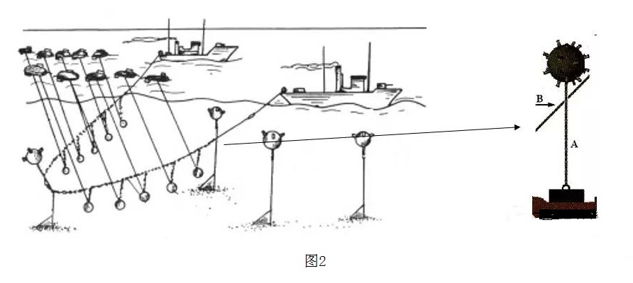 (A)钢索A的作用是固定水雷。同样可以实现这一功能的方式有多少种,能否找到一种方式可以固定水雷,但同时不影响钢索B的通过呢?