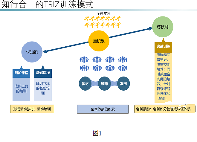 在学知识和练技能方面,我们可以建立一套“知行合一”推进思路帮助企业深化TRIZ方法。在该体系中,不仅包括学知识、练技能的内容,还应该包括积累的部分。企业应该在教材、内部讲师、案例等方面进行积累,使得企业逐步形成自主发展的创新体系。