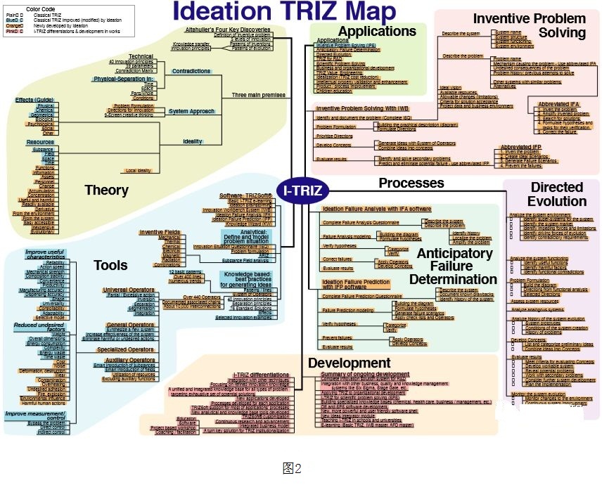 Zlotin在TRIZ体系的完善上做了很多工作,我们常说的物理矛盾由四个分离方法来解决(时间分离、空间分离、条件分离和系统层次分离)就是这位老先生在阿奇舒勒理论的基础上提出的。在这些年的发展中,iTRIZ发展出了庞大的理论体系,如图2。这个体系太庞大,我也不是完全理解,所以不便评述。