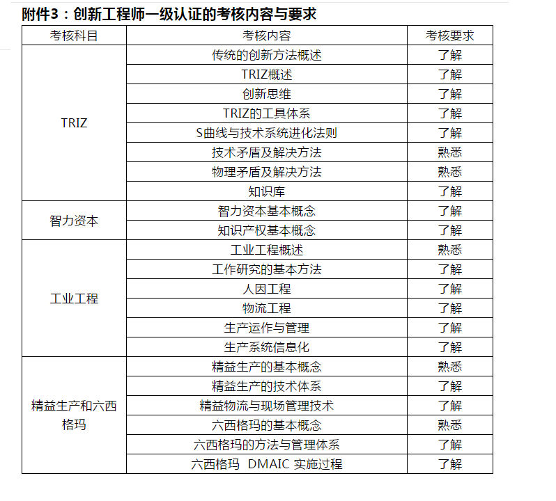 创新工程师认证,考虑的不是TRIZ的问题,考虑的是如何推进中国企业的技术创新问题。因此,这个大纲就不局限于TRIZ内容。创新工程师的大纲考核内容包括四部分知识:1.TRIZ;2.智力资本;3.工业工程;4.精益生产和六西格玛。并且,创新工程师的认证是六级认证体系。创新工程师的课程体系比较庞大,笔者在附件3列出了一级认证的课程大纲,其他级别的课程大纲请大家自行查阅。