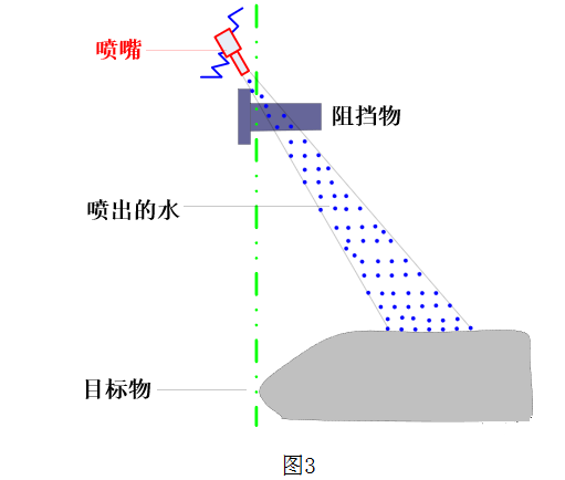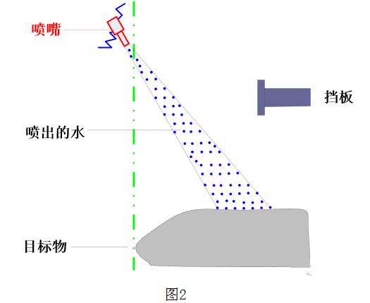 一个产品原来的设计如图2,喷嘴喷出的水可以喷到目标物上。但是由于设计的改进,挡板会周期性的运行到水喷射的路径上。如图3: