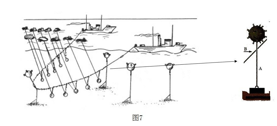 敌人知道布雷后,采用了特殊船只-扫雷舰(minesweeper)。扫雷舰上有特殊装置-专用钢索,凭借它能安全地找到水雷,消除其危害性,如图7。因此:如何能让敌军的扫雷舰不发现水雷,使水雷停留在原地?