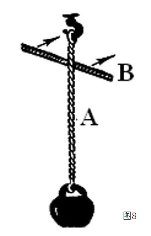 以上问题可以简化为如下问题:挂有重物的钢索A需牢固地与钩子相连。平面上有一根钢索B与其垂直相交,钢索B不停地运动。如何使钢索B持续运动,不切断钢索A,也保证自我完整?如图8: