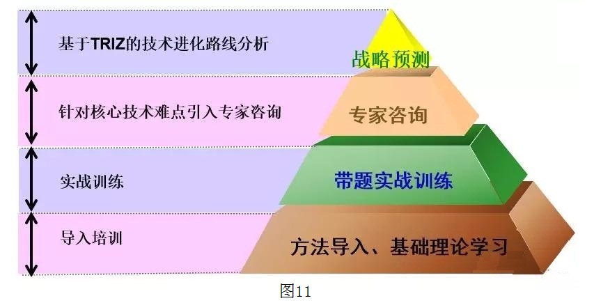 正如前文所述,高端装备制造业的竞争核心是关键技术的竞争,而这些技术的解决背后是有可以遵循的共同规律。高端装备制造业系统的引入TRIZ方法是对于自身研发能力提升的关键。我们可以参考如下模型,分步骤、分层次的引入科学的方法。如图11: