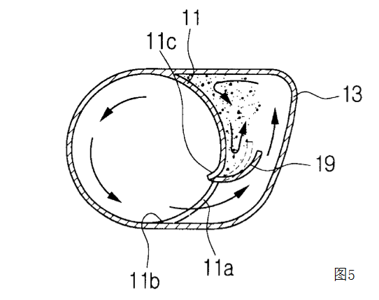 如果我们把视角从进气口油网的改进,变为如何高效的把清洁空气与油烟进行分离,那么我们的视角就会广阔得多!例如:在戴森吸尘器中就使用过很多利用离心进行烟尘分离的技术,如图5,详细可参见美国专利(专利号:6432154, Cyclone dust collecting apparatus for a vacuum cleaner, 08/13/2002)。像类似的方式还有很多:如涡流分离、惯性分离、甚至通过加电场进行分离。