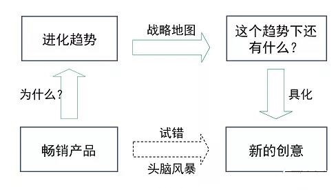 沿着这个思路,我们是不是可以更深入地挖掘新的产品?其他品类的产品是否可以按照这一思路进行挖掘?不仅可以,还必须这么做。我们在进行产品创新时需要进行思维发散,但思维的发散不应无规则,而是科学的。TRIZ方法就提供了这一科学线索,我们通过分析畅销产品定位“畅销”的技术原因,得出技术趋势;进而根据技术趋势判断未来产品发展方向策划出下一款爆品。这才是科学的路径(图3)。