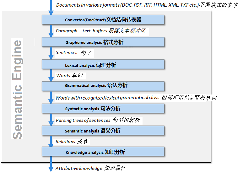 德合伟业的知识服务管理平台所用的自然语言处理技术语义引擎流程如下: